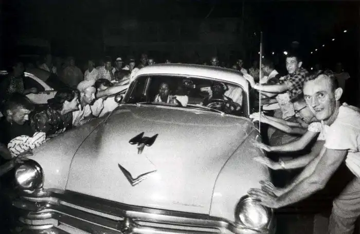Разъяренная толпа белых граждан США пытается преградить путь и раскачать машину чернокожих, которые пытаются отъехать от первого учебного заведения для интегрированного обучения представителей разных рас в Клинтоне, штат Теннеси (1956 год)