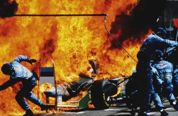 Знаменитый пожар в зоне пит-стопа команды «Бенеттон-Форд», случившийся в 1994 году.