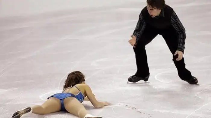 Джессика Дюбе и Брайс Дэвисон - он только что, во время выступления, на глазах у тысяч зрителей, разрезал ей лицо коньком
