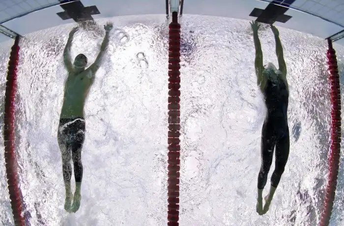 Американский пловец Майкл Фелпс опережает сербского пловца Милорада Чавича на 0,01 секунды на финише дистанции 100 метров баттерфляем.