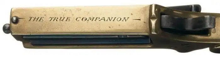 На фото пистолет-кастет "Настоящий компаньон". Такое оружие производилось на основе патента Джозефа Делакше №90314 от 5 июля 1844 года. Оружие предназначено для стрельбы шпилечными патронами.