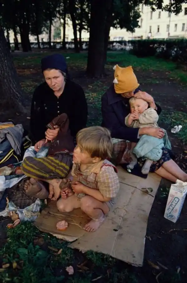 Бездомная семья из Смоленска, приехавшая в Москву после того как их дом сгорел, 1993 год