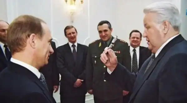 Борис Ельцин дарит Владимиру Путину ручку, которой был подписан его указ об отставке, 1999 год
