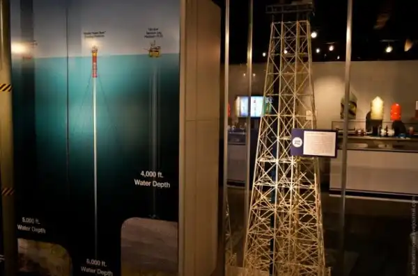 Морские платформы бывают различных видов: стационарные, свободно закрепленные ко дну, полупогружные, мобильные с выдвижными опорами. Далеко не все представляют масштаб буровых платформ, вот несколько интересных сравнений. Это модель основания платформы Bullwinkle, находящейся в Мексиканском Заливе. Высота основания платформы — 533 метра, из них 412 находятся под водой. Диаметр основных труб — 3 метра, площадь основания — 1.8 га, а площадь буровой палубы вышки — 3 350 метров. 28 свай были забиты через трубы основания на глубину 122 метров в морское дно для удержания конструкции от морских течений. Общий вес основания — 69 854 метрических тонн.
