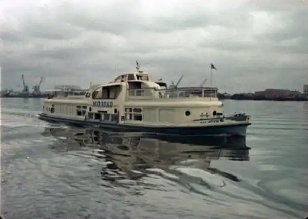 Речной молоковоз, ранним утром уже спешит в Москву, 1956 год.