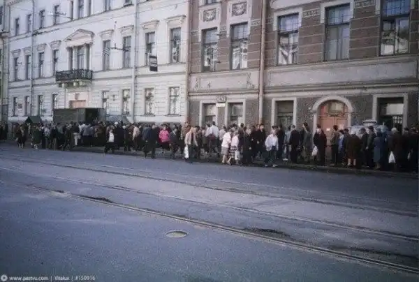 Очередь за водкой. 1-я линия Васильевского острова. Ленинград. СССР. 1990 г.