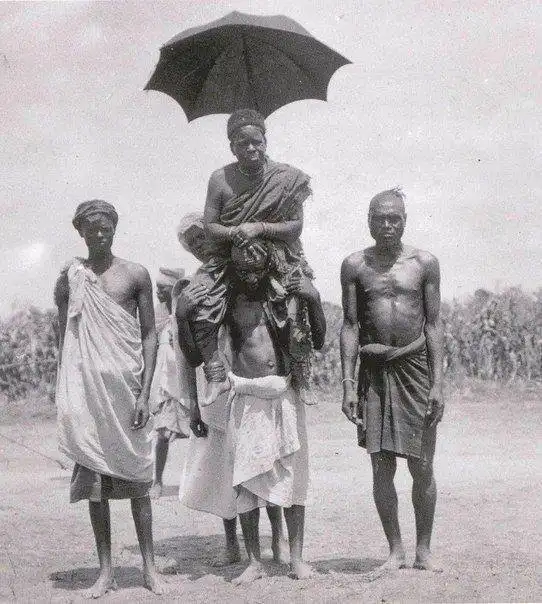 Африканский король верхом на подданном и с зонтиком. Германская восточная Африка, 1913 год