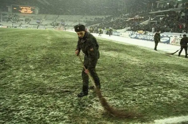 Подготовка газона перед матчем Россия - Италия, Москва, 1998 год.