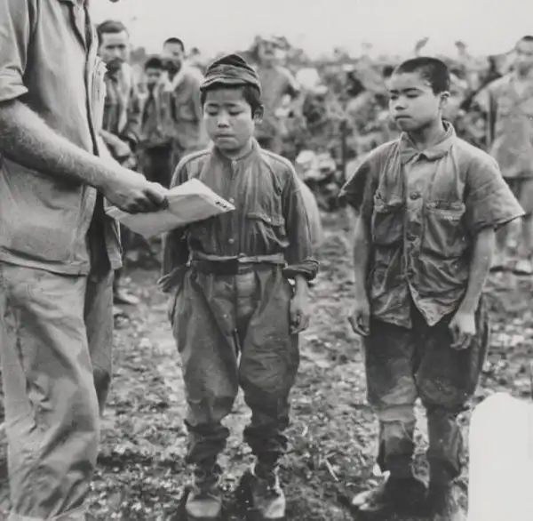 Американский военнослужащий пытается что то объяснить пленным японским солдатам. Левый японец утверждал, что ему 18 лет, правый, что 20. Июнь 1945 год