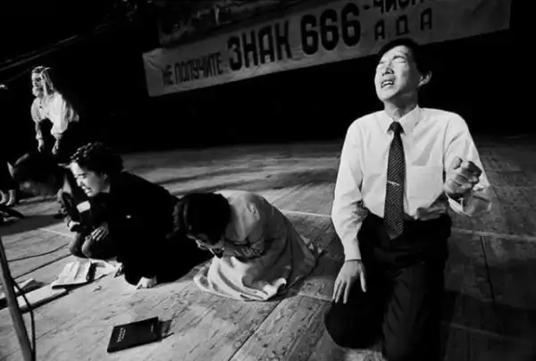 Коллективная молитва одной из сект в ожидании конца света. Москва, 1992 год.