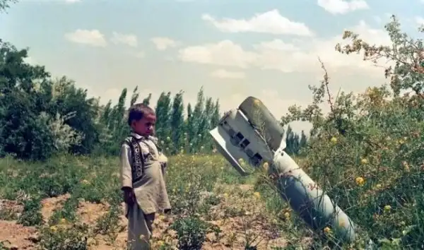 Афганский мальчик смотрит на неразорвавшеюся бомбу, сброшенной российскими войсками во время советско-афганской войны, июль 1989 года.