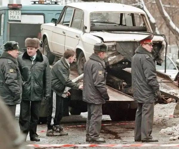 Милиционеры осматривают машину после того, как она взорвалась у посольства США в центре Москвы. 17 января, 1999 года.