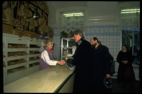 Президент США Билл Клинтон в хлебном магазине. Москва, 14 января 1994 года.
