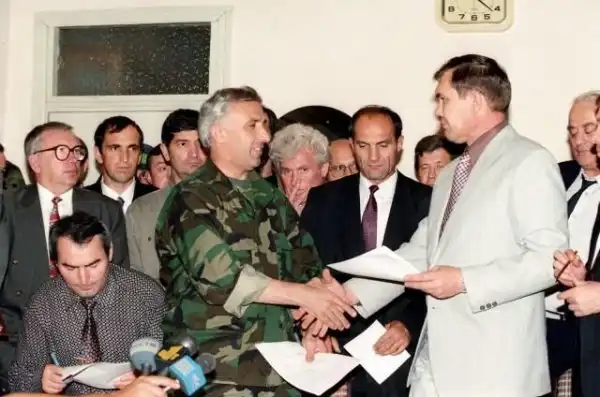 Начальник Генерального штаба Вооруженных сил Чечни Аслан Масхадов и Председатель Совета безопасности России Александр Лебедь пожимают друг другу руки после подписания Хасавюртовского соглашения, посвященного окончанию Первой чеченской войны. Хасавюрт, 30 августа 1996 года.