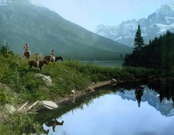 Индейцы племени пикани исследуют местность где-то в Северной Монтане. Около 1908 года.