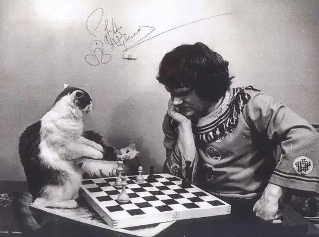 Дрессировщик Юрий Куклaчев проигрывaет своему коту в шаxматы, 1980-е годы.