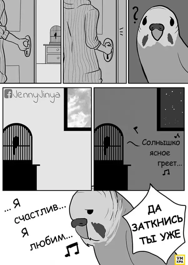 Рисующая грустные комиксы немецкая художница Jenny_Jinya порадовала пользователей сети новой трогательной работой. Сюжет нового комикса посвящен волнистому попугайчику и его жизни в новой семье.