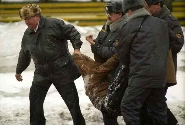 Сотрудника ОМОНа, при содействии активиста, устраняют упившегося любителя футбола со стадиона Локомотив. Чемпионат России, 1996 год.