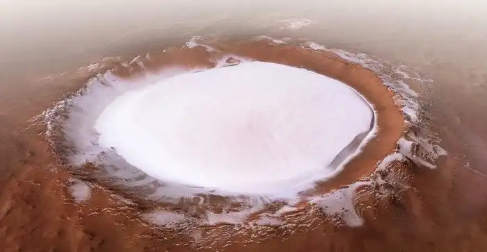 Марсианский кратер с замерзшим озером внутри. Его диаметр составляет 81,37 км