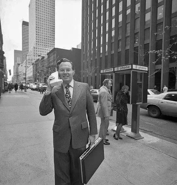 Инженер компании Motorola Джон Митчелл с первым мобильным телефоном.
