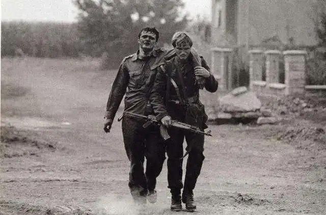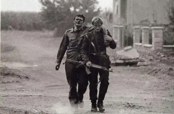 Сербский боец выносит из боя раненого товарища. Потом он отправился за другим и был убит. Вуковар, 1991 год.