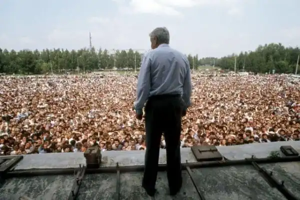 Борис Ельцин проводит встречу с бастующими шахтерами в Воркуте, Республика Коми, Россия, 1990 год.