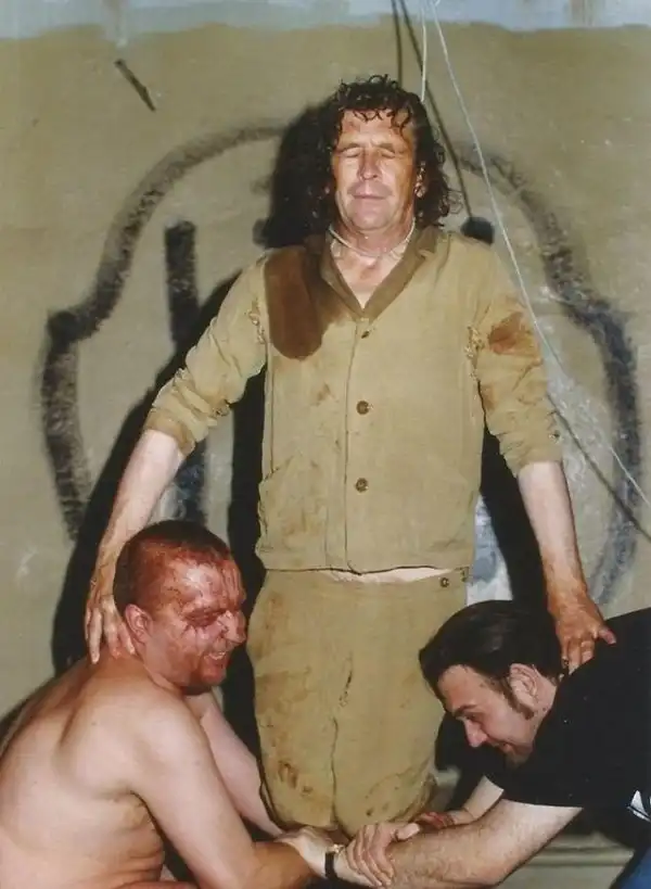 На съемках артхаусного фильма Светланы Басковой «Зеленый слоник», 1998 год. Финальная сцена с повесившимся полковником, роль которого исполняет Александр Маслаев. Поддерживают его Сергей Пахомов и Олег Мавроматти.