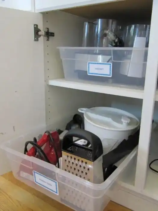 "Если повесить офисный контейнер для файлов на внутреннюю стенку дверцы в шкафчик с контейнерами, то крышки у них перестанут теряться".