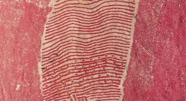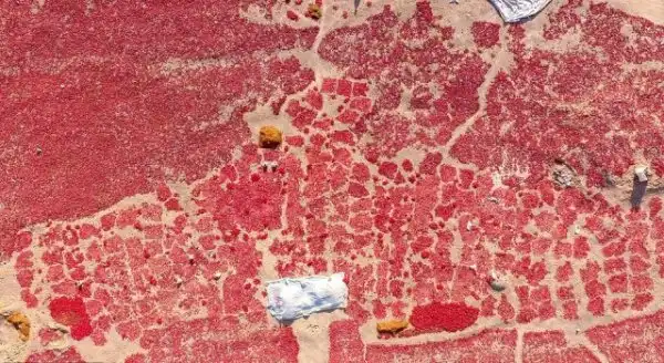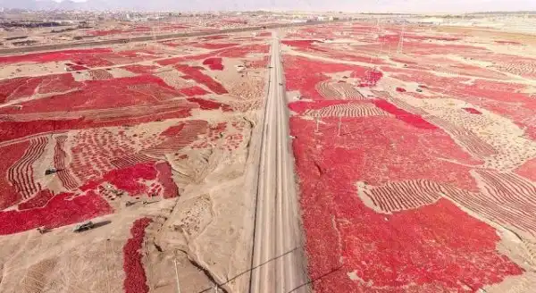 Удивительные аэрофотоснимки показывают поля перцев в Кучэ, Синьцзян-Уйгурском автономном районе на северо-западе страны. Фермеры сажают чили после сбора урожая чеснока примерно в мае. Перцы собирают с августа по октябрь, а затем отправляют на рынок, как только они высохнут.