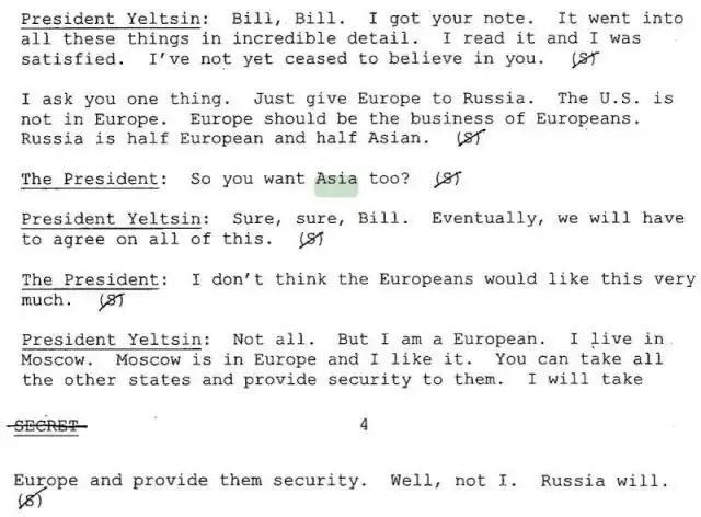"Ельцин: Билл, я прошу тебя об одном. Просто отдай Европу России. США не в Европе. Европой должны заниматься европейцы. Россия — наполовину Европа, наполовину Азия.