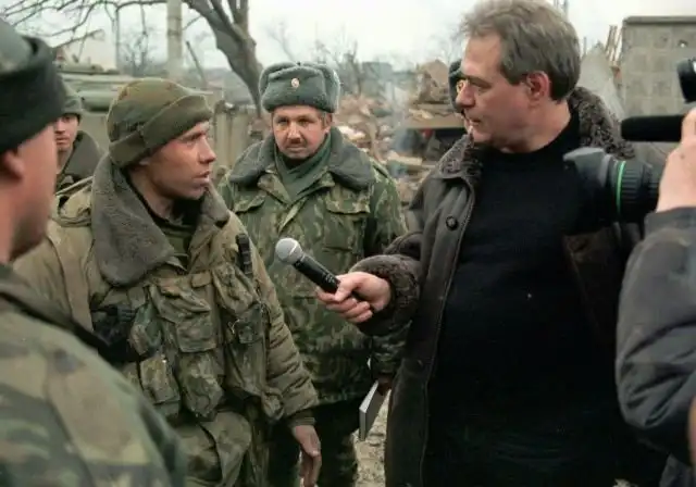 Тележурналист Сергей Доренко общается с российскими солдатами на площади Минутка в Грозном. 6 февраля 2000 года.