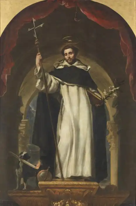 Святой Доминик, тоже борец с ересью, всегда с песом, звездой, лилией и книгой