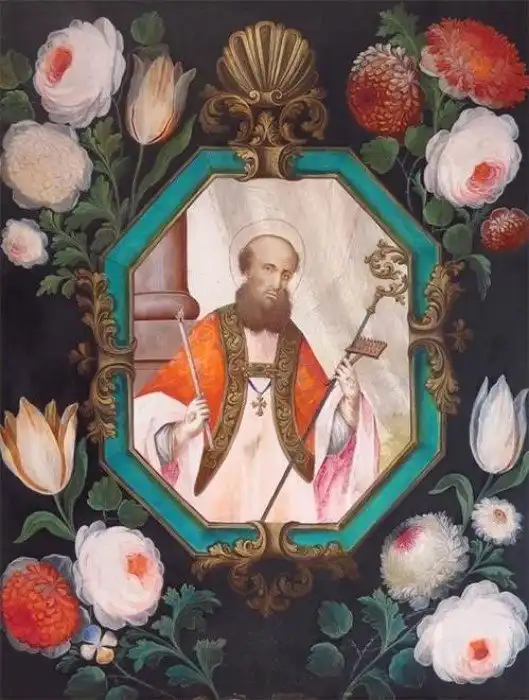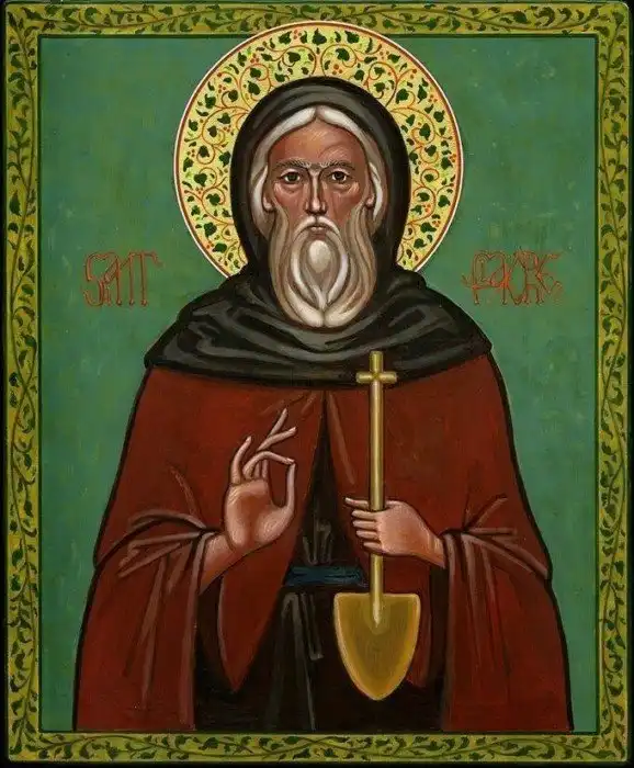 Святой Фиакр всегда с лопатой - чудо вскопки земли под святой скит - Фиакр провел посохом по земле, которую хотели отдать под храм и она сама вкопалась. Кстати святой лечит геморрой