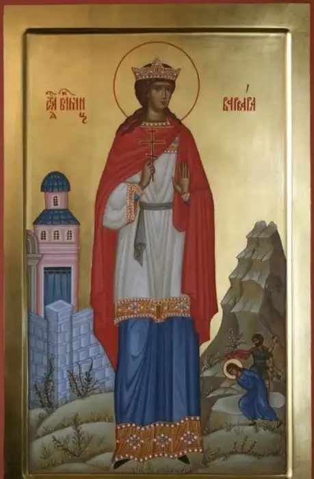 Варвара Илиопольская, покровительница артиллеристов, всегда с башней в которой она возжелала сделать три окна во имя Святой Троицы