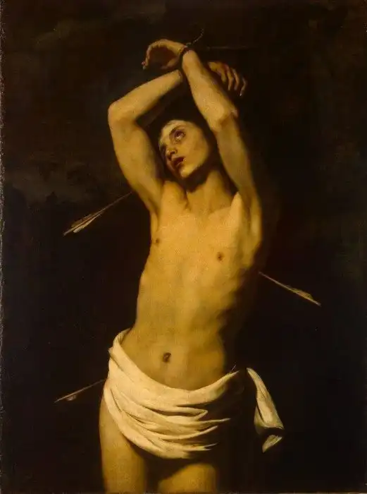 Себастьян - всегда со стрелами, которыеми он был казнен за верну, но не умер, а пришел к своему палаче в таком виде - утыканным стрелами. Является заступником от чумы (любых пандемий)