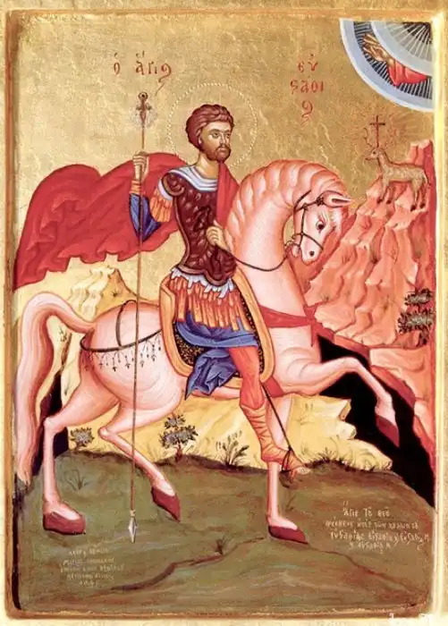 Евстафий, покровитель охотников, всегда с оленем - в него превратился Христос и привиделся Евстафию, ставшему после этой встречи ярым верующим