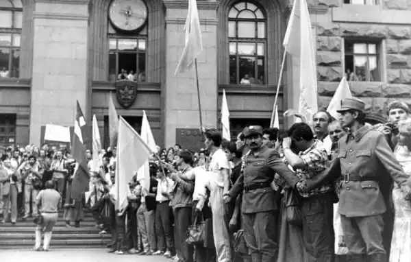 24 июня 1990 года. Поднятие украинского флага перед зданием на Крещатике.
