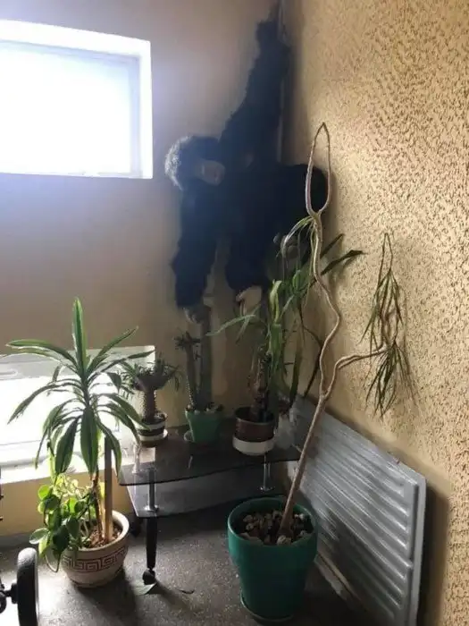 Несколько вазонов, старый столик и мягкая игрушка преобразили лестничную площадку