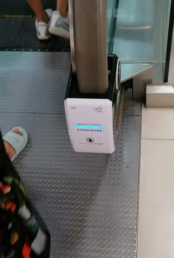 Автоматические УФ-стерилизаторы на эскалаторе в торговом центре.