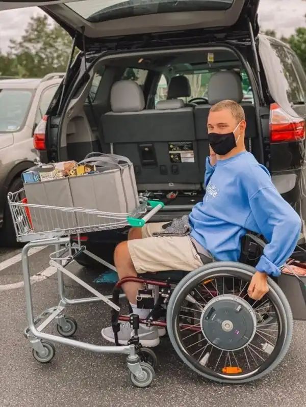 Продуктовая тележка, которую можно прикрепить к инвалидному креслу.