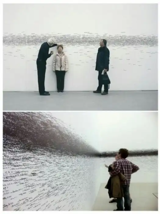 7. В музее современного искусства в Нью-Йорке люди отмечают свой рост на белой стене, что дало очень наглядное представление о среднем росте общества.