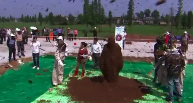 Люди любят устанавливать странные рекорды. Совершено непонятно зачем, житель Китая по имени Жуань Лянмин посчитал своим долгом внести свое имя в Книгу Рекордов Гиннесса. Чтобы осуществить свою цель, его тело стало местом отдыха для невероятного количества пчел. На нем разместилось 63 килограмма жужжащих насекомых. Затея китайца была опасна для жизни, но Жуань отлично поладил с пчелами и установка рекорда прошла без происшествий.