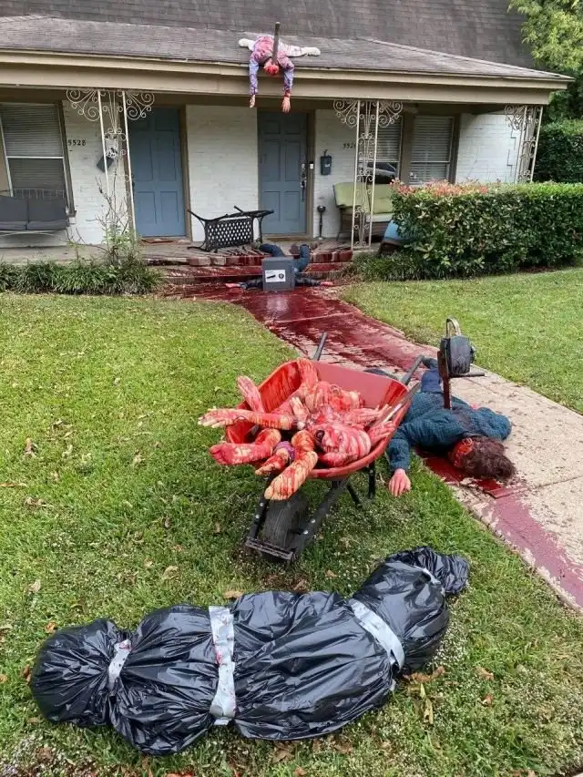 Американец оставил перед крыльцом куклы в человеческий рост: одной голову раздавило сейфом, в спине другой застряла бензопила, третья "четвертованная" кукла оказалась в мусорном мешке, а четвертый "труп" оказался на крыше с пробитой головой. А для пущего ужаса, всю эту инсталляцию Стивен залил 75 литрами искусственной крови.