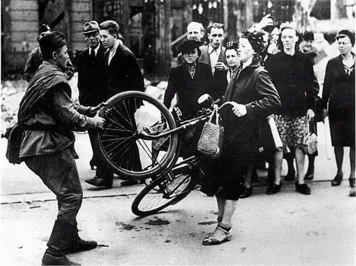Это фото часто можно видеть с подписью "Советский солдат отбирает велосипед у немки"