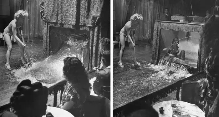 С первого взгляда, на фото изображен какой-то старинный трюк, в котором что-то пошло не так и исполнительницу пришлось спасать из аквариума. На самом деле женщина с топором - Китти Вест (также известная как "Эванджелин девочка-устрица"), которая разбила стеклянную коробку в порыве ярости. Исполнительница бурлеска в Новом Орлеане в конце 1940-х годов поссорилась с девушкой, которая демонстрировала подводный стриптиз в гигантском "стакане", заполненном водой. Во время выступления Китти и разбила инвентарь своей соперницы, после чего начала драку.