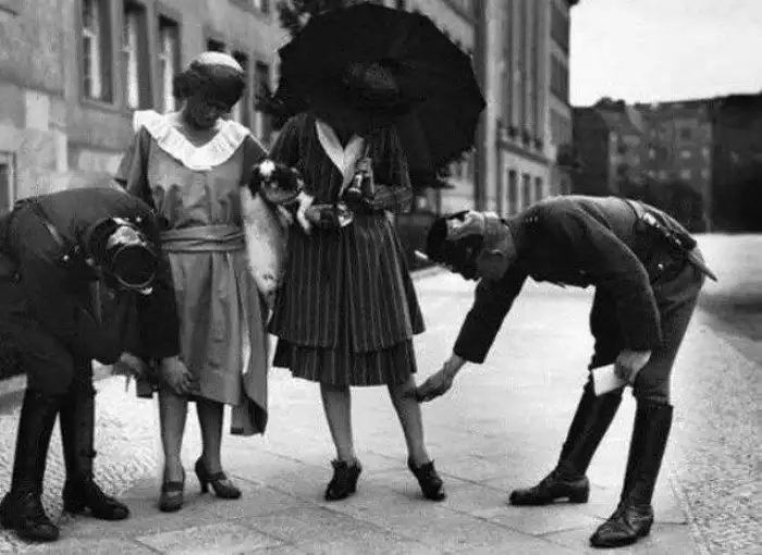 Полиция измеряет длину юбок у девушек, Берлин, 1922 год.