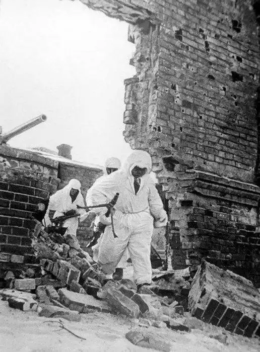Советские бойцы в маскхалатах продвигаются в развалинах Сталинграда, 1943 год