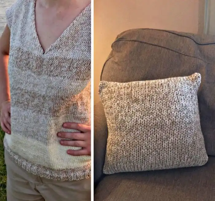 «Рубашка, которую я связала, не подошла по размеру, поэтому я распустила ее и сделала чехол для подушки»