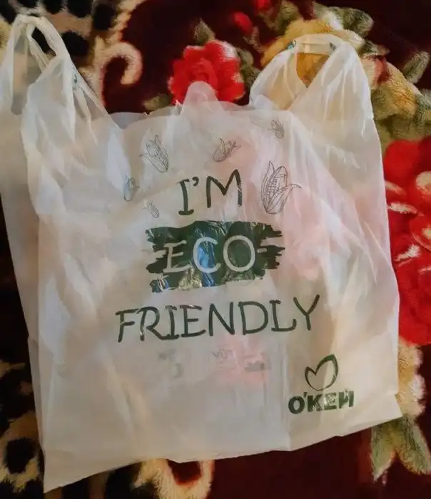 «Кукурузный пакет. Прикольный. Не так громко шелестит, тихий, мягкий, приятный на ощупь»