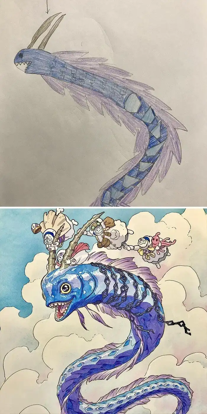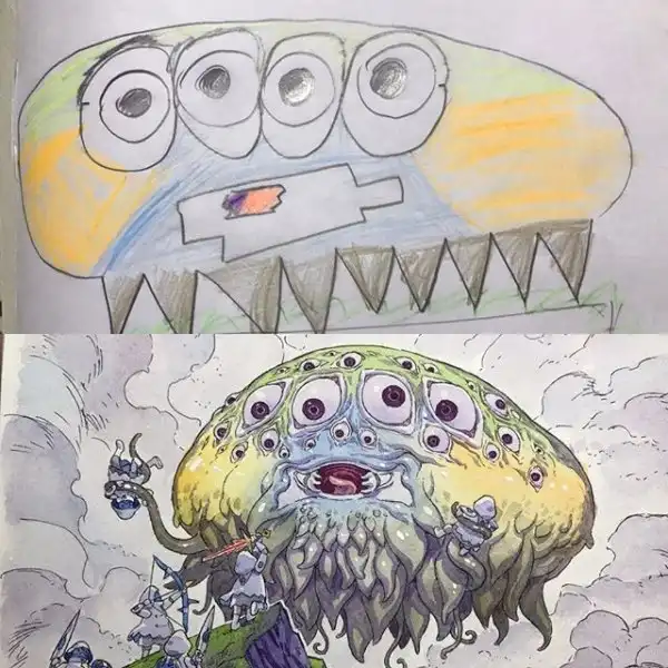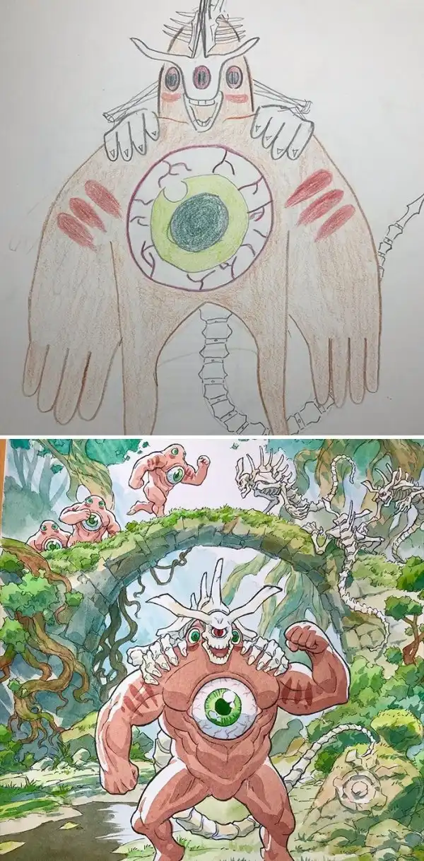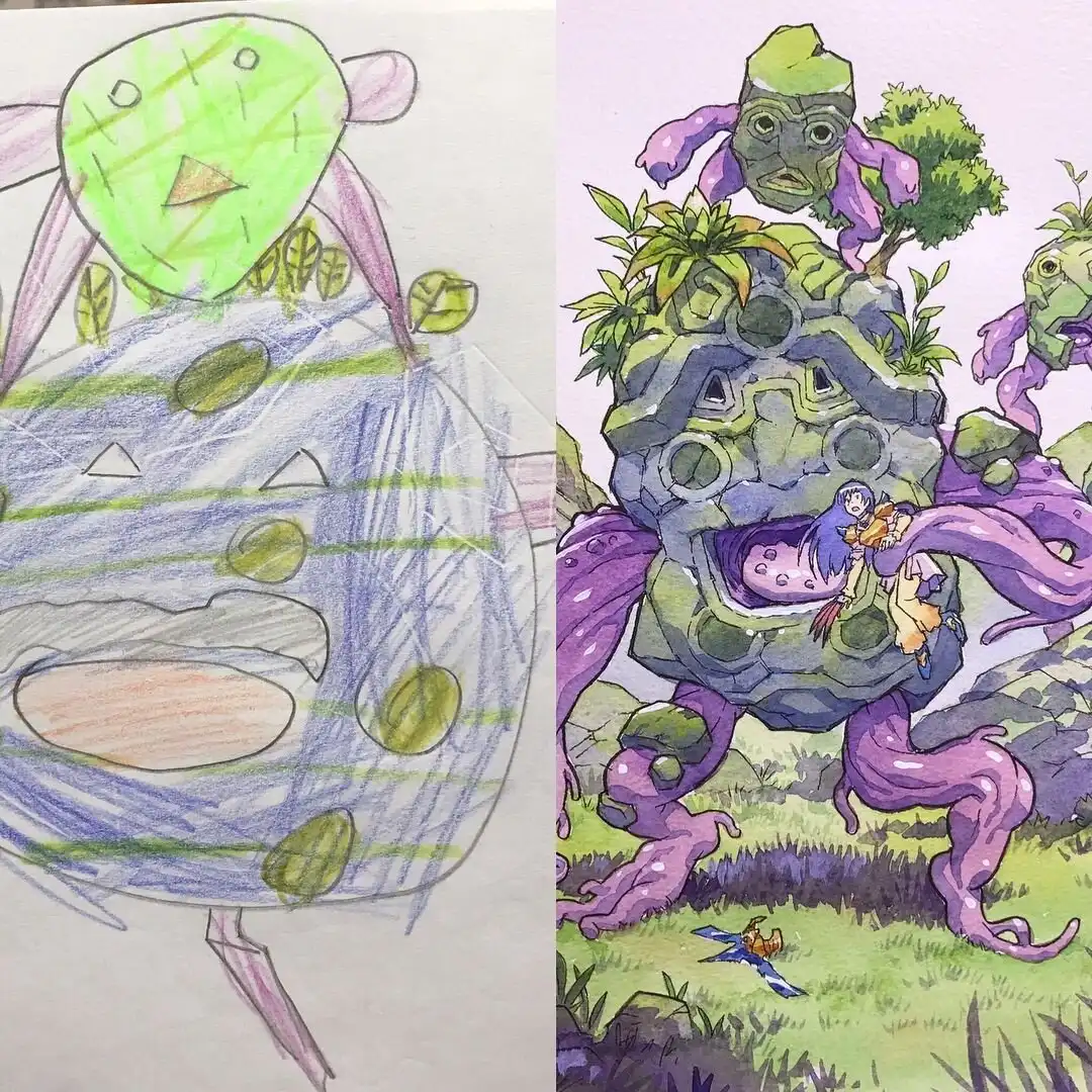 Дети рисуют причудливых существ со свойственной им неуемной фантазией, а папа доводит эти рисунки до совершенства!